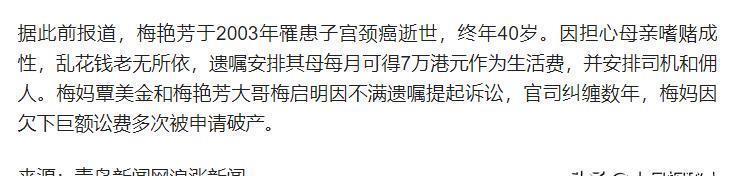 但凡是梅艳芳生前用过的东西,她都拿来卖钱,想要榨干女儿最后一丝价值。直到最近,梅艳芳的大哥公开寻找失踪的母亲,才明白梅艳芳为什么会那样安排。她知道母亲嗜赌成性,怕她老了后没有依靠,所以遗嘱中安排了每月七万港元的生活费。